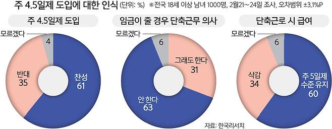 주 4.5일제는 이 대통령의 대선 공약 중 국민적인 관심이 높은 사안이다. 지난 2월 한국리서치 여론조사에 따르면 성인 남녀 61%가 주 4.5일제 도입에 찬성했다. 세대별로 봐도 70대 이상(반대 57%)을 제외한 전 연령대에서 과반이 긍정적으로 응답했다.