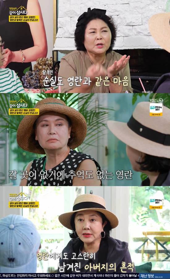 김영란은 "아버지 밑으로 형제가 10명인데, 아버지와 고모를 제외하고 다 북한에 남았다. 내 핏줄들이 거기에서 고생하고 있나라는 생각에 많은 걱정을 하신다"며 슬픈 이야기를 전했다. 이에 이순실은 "앞으로 우리도 그분 마음처럼 살 거다. 줄줄이 남아 있는 형제들 생각에 마음이 아플 것"이라며 실향민으로서의 설움을 토로했다.