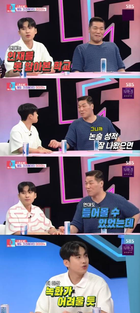 미미미누는 "이 얘기 나올 줄 알았다. 저는 연세대학교를 눈에 들이지도 않았다. 저는 논술에서 3번 연속 떨어뜨렸다. 인재를 못 알아본 학교"라고 했고, 서장훈은 "논술 성적 조금 더 잘 나왔으면 연세대도 들어올 수 있었는데"라고 긁어 웃음을 자아냈다.