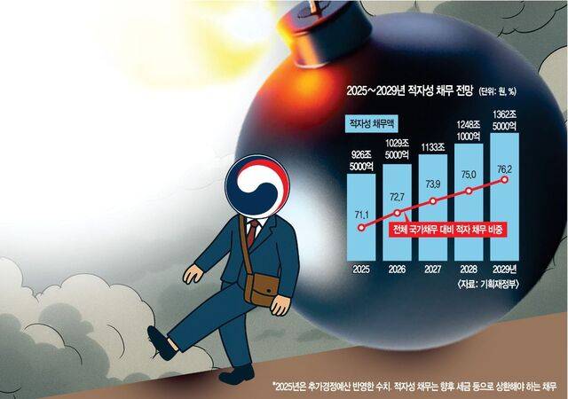 국민 세금으로 갚아야 하는 적자성 채무가 이재명정부 내에 크게 불어날 전망이다. 적자성 채무는 올해부터 2029년까지 4년간 약 440조원 늘어 국가채무에서 차지하는 비중도 70%를 훨씬 웃돌 것으로 예상된다. 국가보증채무와 공공기관 부채 등 ‘잠재 채무’도 급증할 것으로 전망돼 나랏빚 관리에 경고등이 켜졌다.