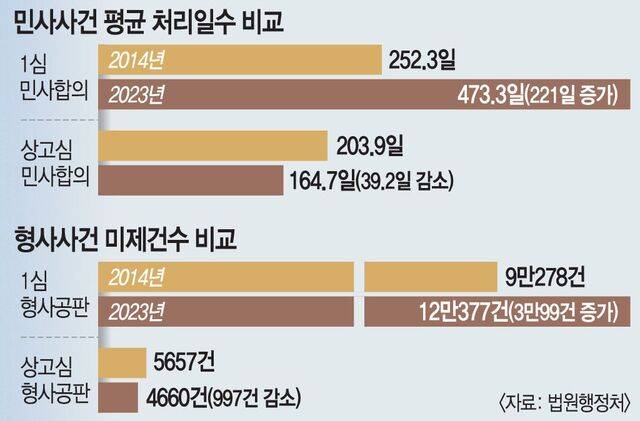 대법관 증원보다 하급심 강화가 시급하다는 점은 통계에서도 드러나고 있다. 1심 민사합의 사건의 평균 처리일수는 2014년 252.3일에서 2023년 473.3일로 늘었다. 반면 같은 기간 상고심 민사합의 사건 평균 처리일수는 203.9일에서 164.7일로 줄었다. 형사재판부 미제사건 건수도 1심의 경우 9만278건에서 12만377건으로 증가한 반면 상고심은 5657건에서 4660건으로 감소했다.