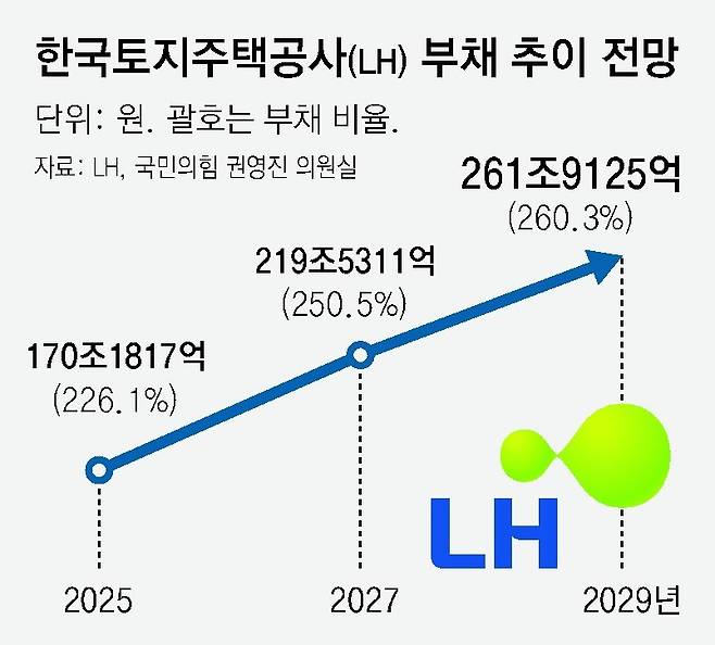 8일 LH의 ‘2025∼2029년 중장기 재무관리계획’에 따르면 올해 부채는 170조1817억 원으로 전망된다. 내년에는 192조4593억 원, 2027년 219조5311억 원 등 계속 늘어날 것으로 보인다. 부채가 증가하는 주요 원인은 임대 주택이다. 저소득층에 시세보다 낮은 가격으로 임대하다 보면 적자가 발생할 수밖에 없기 때문이다. 그 대신 주택용지를 민간에 매각해 적자를 보전해 왔는데, 이번 대책에는 이런 ‘땅장사’를 금지하는 대신 주택 공급 재원을 어떻게 마련할지에 대한 구체안이 빠졌다.