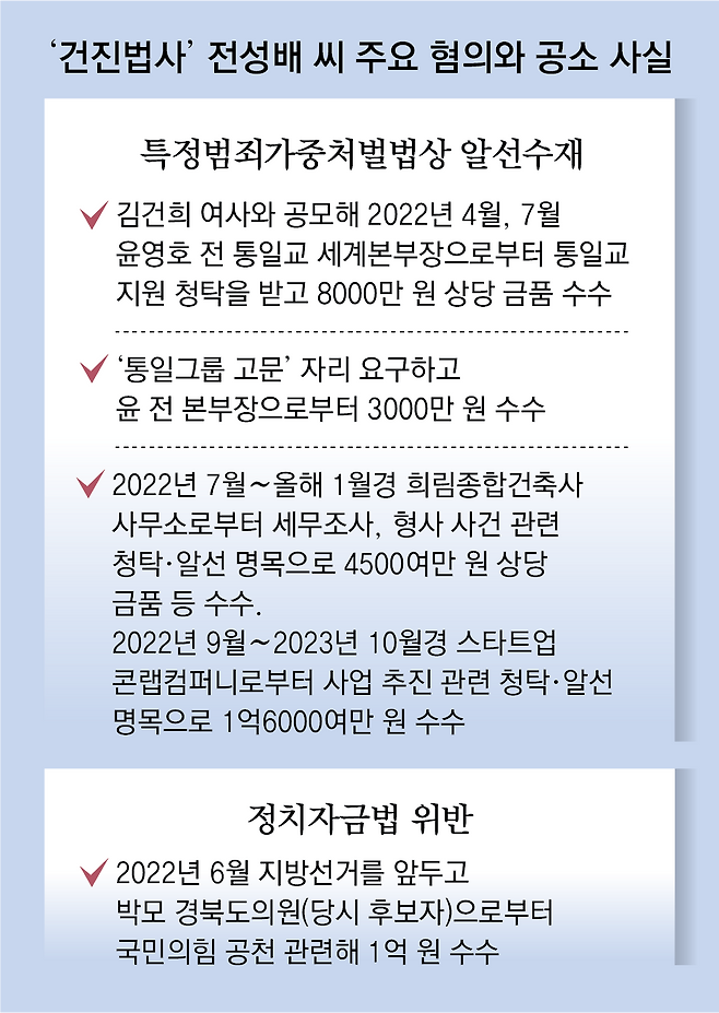 전 씨는 2022년 5월 지방선거를 한 달 앞두고 경북 봉화군 경북도의원에 출마한 박모 씨로부터 국민의힘 공천을 받게 해달라는 청탁과 함께 1억 원을 수수한 혐의(정치자금법 위반)도 받는다. 전 씨가 이처럼 청탁과 알선 명목으로 받아 챙긴 금액은 4억1500만 원에 달하는 것으로 조사됐다.