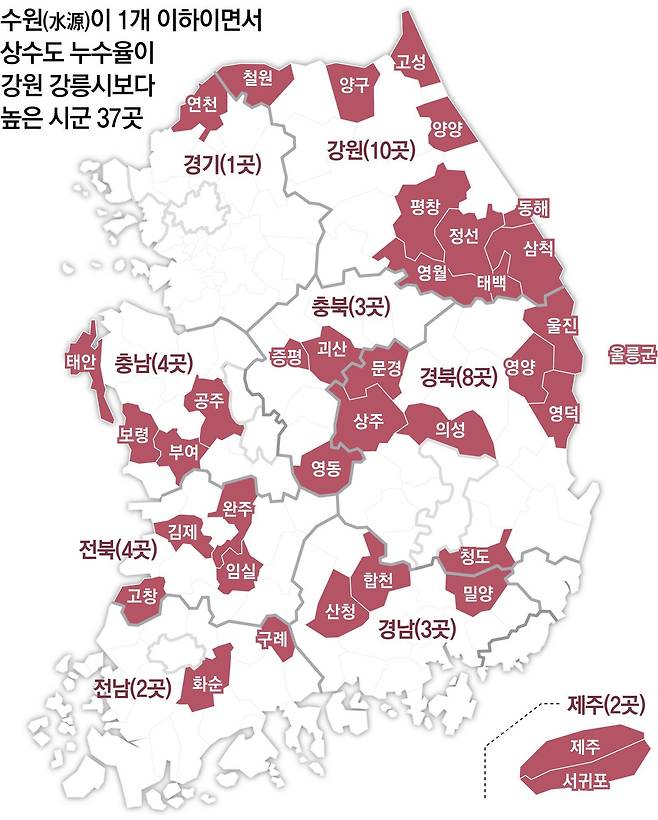 8일 동아일보가 환경부 ‘상수도 통계’와 국가가뭄정보포털 데이터 등을 분석한 결과, ‘제2의 강릉’이 될 수 있는 지역이 총 37곳인 것으로 나타났다. 이 지역들은 모두 다목적댐·용수댐·저수지가 1개 이하면서 수도관을 통해 새어나간 물의 비율이 강릉(23.4%)을 웃돌았다. 전국 평균 상수도 누수율은 약 10%인데, 이보다 적게는 2배에서 많게는 6배로 많은 물이 낭비되고 있었다.