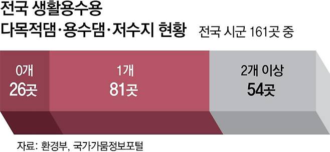충남 보령시의 경우 보령댐 하나에 생활용수뿐 아니라 산업용수까지 완전히 의존한다. 누수율마저 40.7%로 높아 매년 물 부족에 시달리고 있다. 보령댐에 기댄 청양 등 시군 8곳의 인구만 50만 명이 넘는다. 여기에 인근 산업단지와 화력발전소도 보령댐의 물을 사용하고 있다. 가물면 주민뿐 아니라 지역 산업까지 동시에 타격을 받는 구조다.