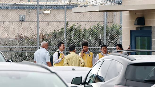 ▲ 8일(현지시간) 미국 당국의 이민단속으로 체포된 현대차-LG엔솔 배터리공장 건설 현장 직원들이 수감돼 있는 있는 조지아주 포크스턴의 이민세관단속국(ICE) 구금시설 앞에서 대사관 관계자들이 교섭을 마친 후 이동하고 있다.