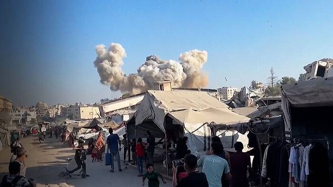 이 매체가 소셜미디어에 올린 영상을 보면 임시 거주용 텐트가 즐비한 난민촌 너머로 고층 건물이 폭격받아 연기가 피어오릅니다.