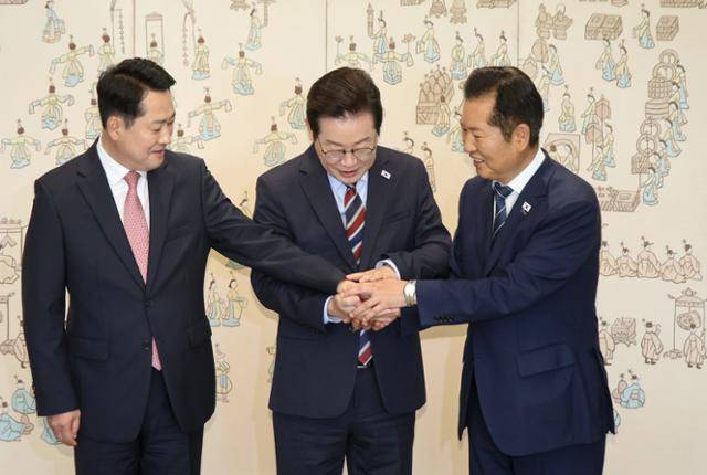 이재명 대통령과 정청래(오른쪽) 더불어민주당 대표, 장동혁(왼쪽) 국민의힘 대표가 8일 서울 용산 대통령실에서 열린 오찬 회동에 앞서 서로 손을 포개 맞잡고 있다. 이 대통령 제안으로 여야 대표들이 취임 이후 처음으로 악수를 나눴다. 왕태석 선임기자