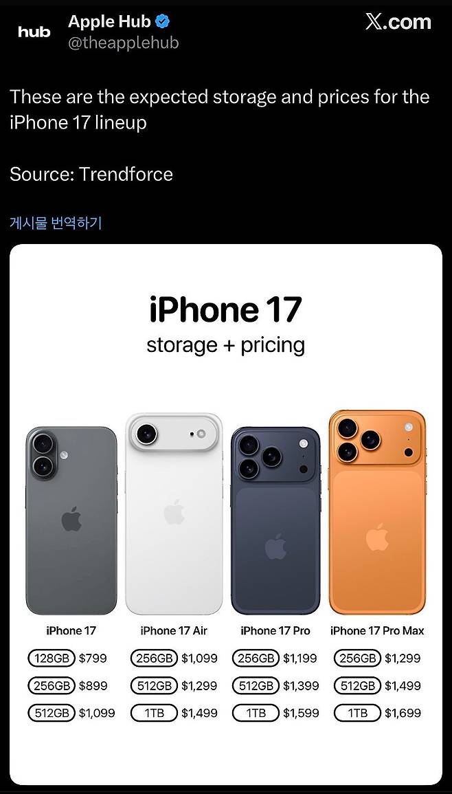9일 업계와 정보기술(IT) 매체 등에 따르면, IT팁스터 주칸이 국내 이통사에서 유출된 것으로 추정되는 아이폰17 출시 정보 문건을 공개했다. 문건에 따르면 아이폰17 시리즈는 업계 예상대로 일반, 에어, 프로, 프로 맥스 등 4종으로 출시되며, 전작까지 유지됐던 플러스 모델은 사라졌다.