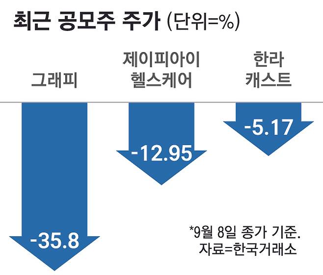 그래피 직전 코스닥에 입성한 두 새내기주 주가도 상장일 이후 부진한 흐름을 보인 뒤 현재도 공모가를 밑돌고 있는 상황이다.