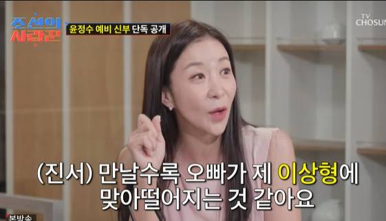 이어 원진서는 윤정수에 대해 "만날수록 이상형. 이해심이 많다 원래 지적이고 섹시한 사람 좋아한다, 제 눈엔 그렇다"꼬 했다.이어 원진서는 "하지만 겸손하고 아빠처럼 듬직한 면이 많다 오빠 안 만났으면 시집 못갔겟다 싶다"며 "이상형에 과분할 만큼 딱 맞다"며 윤정수를 향한 무한 애정을 드러냈다.