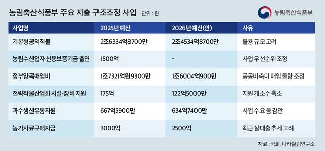 올해 1500억원인 농림수산업자신용보증기금 출연금은 전액 삭감됐고, 정부양곡매입비도 1317억8400만원 감액됐다. 공공비축미 매입 물량이 올해 45만t에서 내년에 40만t으로 줄어드는 데 따른 것이다.