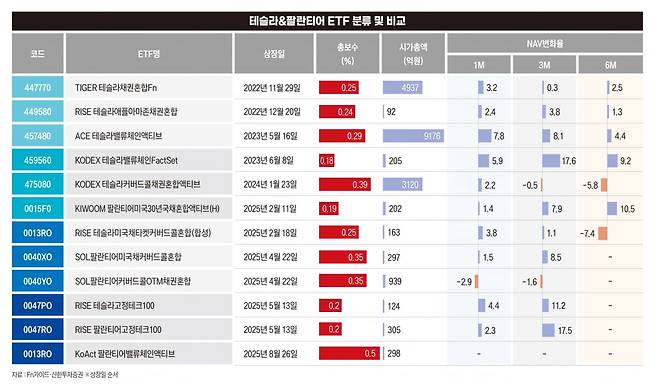 한국거래소와 자산운용업계에 따르면 현재 국내에 상장된 ETF 중 ‘팔란티어’라는 명칭이 포함된 상품은 총 5개, ‘테슬라’를 포함한 상품은 7개다. ETF 규정상 특정 종목 편입 비중은 25% 이내로 제한되지만 나머지 75%의 자산 구성이 각 상품 간 차별점으로 작용하고 있다.