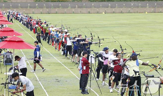 (광주=뉴스1) 김태성 기자 = 9일 광주 국제양궁장에서 열린 광주 2025세계양궁선수권대회에서 리커브 출전 선수들이 연습을 하고 있다. 2025.9.9/뉴스1