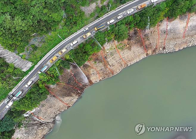 (강릉=연합뉴스) 양지웅 기자 = 9일 강원 강릉시 오봉저수지에서 육·해·공군과 소방, 전국 지자체 및 기관이 지원한 살수차들이 수위를 높이고자 물을 쏟아붓고 있다.