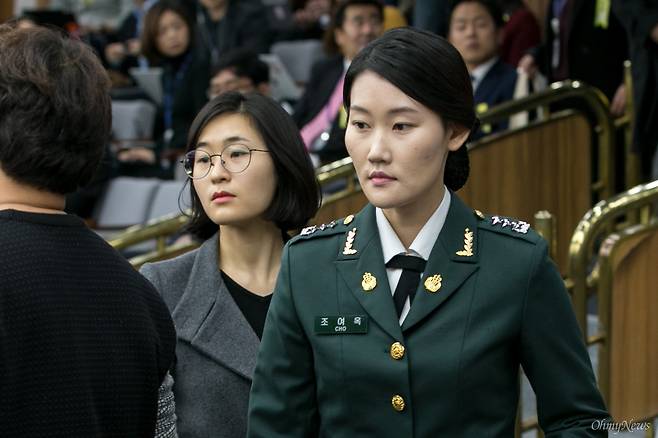 | ▲ 조여옥(오른쪽) 전 대통령경호실 간호장교와 함께 동행한 이슬비 대위가 지난 2016년 12월 22일 오전 서울 여의도 국회에서 박근혜 정부의 최순실 등 민간인에 의한 국정농단 의혹사건 진상규명을 위한 국정조사특별위원회의 5차 청문회에 참석하기 위해 청문회장으로 들어서고 있다. |