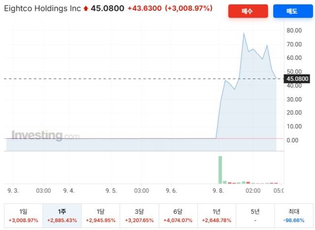 이날 나스닥시장에서 에이트코 주가는 장 초반 한때 5632%까지 치솟으며 시가총액이 2억1000만달러로 불어났다. 이후 일부 상승폭이 줄어들어 전 거래일보다 3009% 오른 45.08달러에 거래를 마쳤다. 블룸버그에 따르면 이날 거래량은 최근 20일 평균의 5만4000배에 달했다. 거래 시작전 시가총액이 440만 달러에 불과했던 에이트코의 현재 가치는 2억 달러에 육박하고 있다.