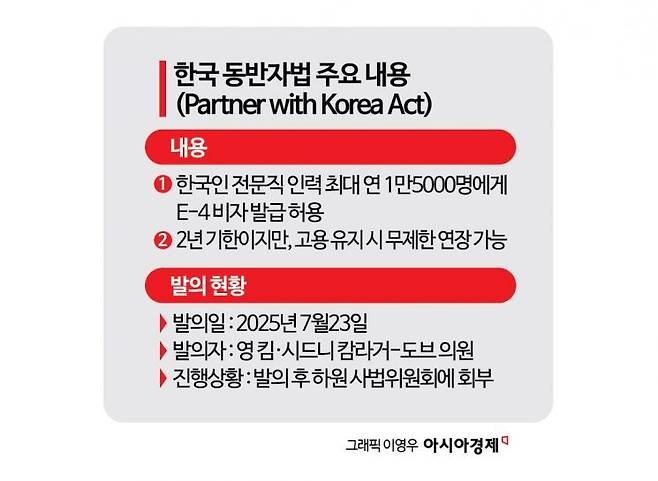 한국 동반자법은 전문 교육을 받은 우리 국적의 기술자를 대상으로 전문직 취업비자(E-4)를 연간 최대 1만5000개 발급할 수 있도록 하는 내용을 골자로 한다. 이 법안이 의회를 통과하면 우리 기업은 기술자를 미국에 파견하는 데 걸리는 시간을 기존 '6개월 또는 1년'에서 '한 달 이하'로 단축할 수 있다. 법안은 지난 7월23일 영 킴 공화당 의원, 시드니 캄라거-도브 민주당 의원이 공동 발의해 통과를 위한 제반 절차를 앞두고 있다.