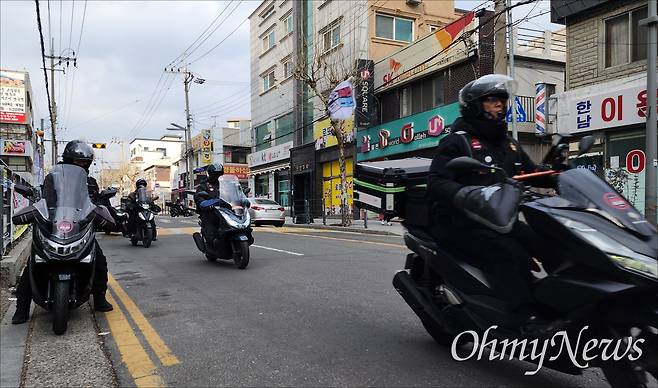 | ▲ 대전에 도착한 '신속탄핵 안전배달 라이더유니온 전국대행진단'이 지난 1월 16일 오후 동구 홍도동 배민B마트 앞에서 대전지역 시민사회단체와 기자회견을 열어 "라이더와 시민의 안전을 위해 유상보험의무화와 안전운임을 도입하라"고 촉구했다. |