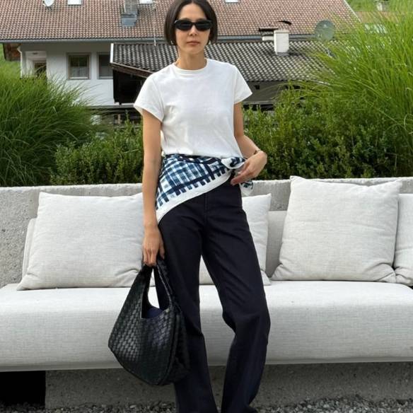 알렉사 청의 스카프 레이어드 룩. 깔끔하고 핏되는 화이트 컬러의 기본 티셔츠를 입고 생지 데님을 매치한 다음 허리에 브라운, 블랙 조합의 스카프를 둘러 우아하고 클래식한 캐주얼 룩을 연출했다.