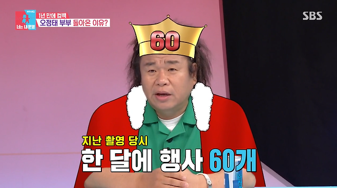 이 모습을 본 김숙은 "행사 더 들어오겠네"라고 이야기했고, 오정태는 "'동상이몽'은 엔터 대표 같은 분이다. 저를 행사의 왕으로 만들어줬다"라며 "지금 행사가 더 늘었다. 그때 당시에 (한 달에) 60개 했는데 지금은 최대 한 달에 90개. 너무 바쁘다"라며 근황을 알렸다.