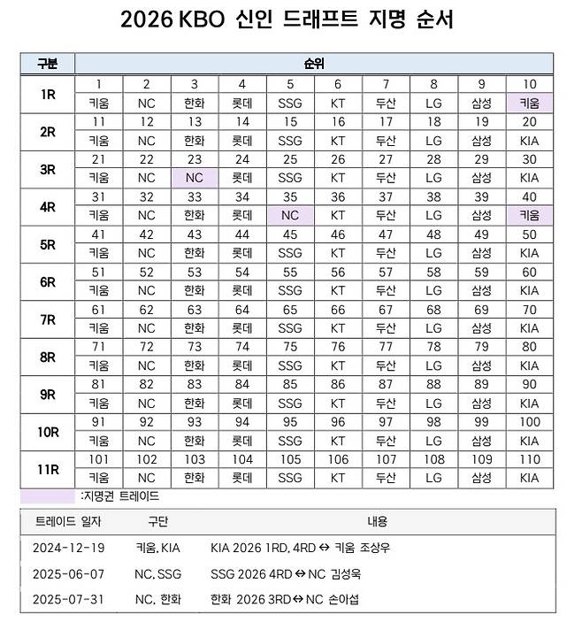 KBO 규약에 따라 2026 신인 지명권이 선수와 트레이드 된 사례는 3차례, 총 4개의 지명권 이동이 있었다. NC는 한화와 SSG로부터 각각 양수 받은 3, 4라운드 지명권을, 키움은 KIA로부터 양수 받은 1, 4라운드 지명권을 갖는다.
