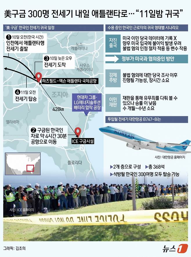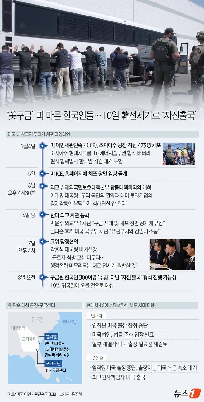 한국 정부가 구금된 한국인 근로자들을 자진출국 형식으로 귀국시키는 방안을 미 당국과 조율 중인 이유다. 다만 이 경우에도 불법 체류 기간이 180일 초과 1년 미만이라면 3년간 입국이 금지된다. 1년 이상 불법 체류하면 자진출국해도 10년 동안 입국이 금지된다.