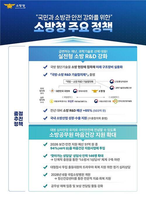 소방청은 '2026∼2030년 소방 R&D 기본계획'을 연내 수립해 급변하는 재난환경과 국민 안전 수요에 선제적으로 대비한다는 방침입니다.