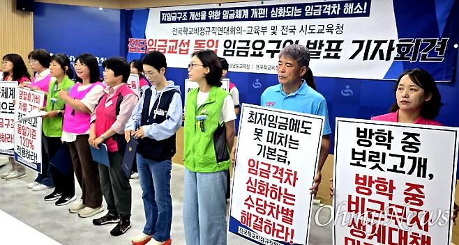 연대회의는 회견문을 통해 "학교비정규직 노동자들은 30년을 일해도 정규직의 절반에 불과한 임금을 받는다. 기본급은 여전히 최저임금에도 미치지 못하고, 각종 수당은 정규직의 절반 수준에 불과하다"라고 설명했다.
