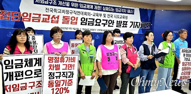학교비정규직 노동자들이 이같이 외쳤다. 전국학교비정규직노동조합 경남지부, 전국여성노조 경남지부, 전국교육공무직본부 경남지부로 구성된 경남학교비정규직연대회의가 9일 경남도교육청 브리핑실에서 기자회견을 열어 임금요구안을 제시한 것이다.