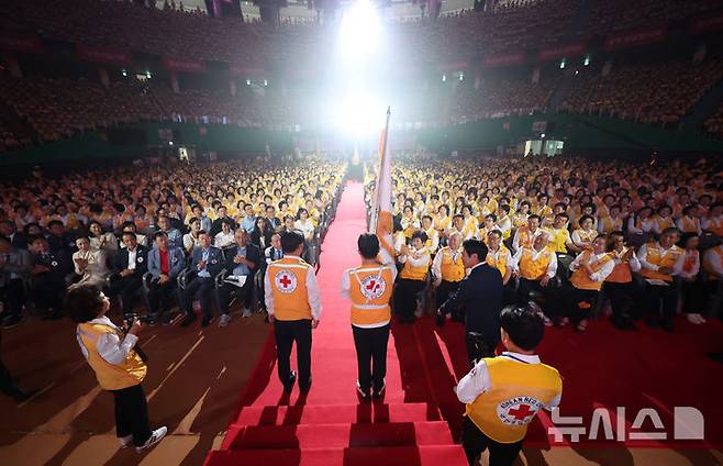 [서울=뉴시스] 조성우 기자 = 9일 서울 송파구 잠실종합운동장 실내체육관에서 열린 대한적십자사 2025년 전국 적십자봉사원 대축제에서 기수단이 입장하고 있다. 2025.09.09. xconfind@newsis.com