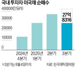 9일 한국예탁결제원에 따르면 지난 7월 이후 이달 5일까지 투자자들은 미 국채 27억8316만달러어치를 순매수했다. 9월이 아직 20일 가량 남은 점을 고려하면 3분기 순매수액은 사상 최고치였던 지난 분기(36억9125만달러)에 근접하거나 넘어설 전망이다.