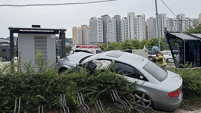 오늘(9일) 오전 11시 30분쯤 경기도 김포시 마산동 교차로에서 70대 A 씨가 몰던 승용차가 변압기를 들이받았습니다.