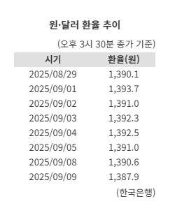 환율 하락세는 미국 고용 지표 쇼크 영향으로 9월 금리인하 기대가 확실시되면서 달러가치가 하락한 데에 기인한다.