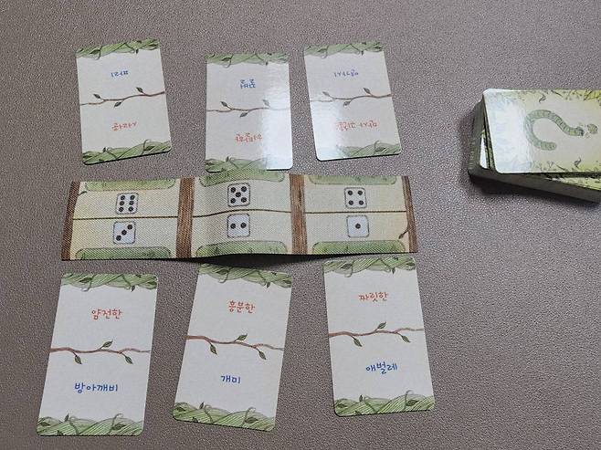 구체적으로 빨간색 단어는 ‘깜찍한’, ‘잔망스러운’, ‘애교 부리는’처럼 성격이나 상태를 나타내고, 파란색 단어는 ‘굼벵이’, ‘거미’, ‘매미’처럼 구체적인 동물이 등장한다. 이 둘이 합쳐지면 ‘애교 부리는 거미’, ‘잔망스러운 매미’ 같은 제시어가 만들어지는 셈이다. 주사위 결과는 출제자만 볼 수 있으므로 다른 이용자들은 오직 연기만 보고 제시어를 추리해야 한다.