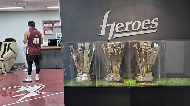 ▲ 9일 서울 고척스카이돔 키움 히어로즈 클럽하우스 입구에 한국시리즈 진출 트로피 3개가 놓여있다.