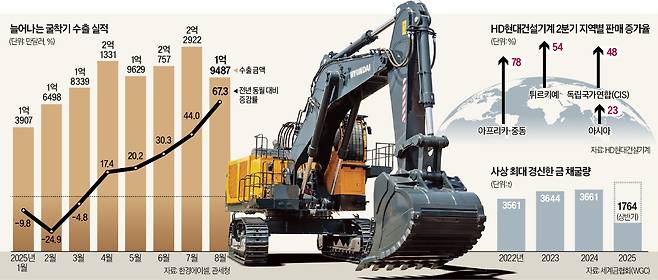 작년만 해도 크게 부진했던 굴착기 수출 회복의 핵심 배경은 아프리카 신흥국 중심의 귀금속과 광산 개발 증가다. HD현대건설기계는 7월 실적 발표 콘퍼런스콜에서 “신흥국의 자원 개발 및 인프라 확충 수요에 힘입어 건설기계 매출이 큰 폭으로 늘어났다”며 “수단 알제리 리비아 에티오피아 등지에서 수주 물량을 지속적으로 확보하고 있다”고 밝혔다.