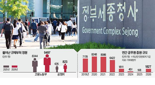 내년 공무원 정원이 약 2000명 늘어난다. 올해 증가폭(108명)의 약 17배다. 특히 고용노동부, 공정거래위원회 등 기업 규제·감독부처 인력이 큰 폭으로 증가한다. 경제계에선 “공무원이 한 명 늘 때마다 규제가 하나씩 증가할 것”이라고 우려했다.