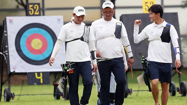 ▲ 9일 광주 남구 광주국제양궁장에서 열린 2025 세계양궁선수권대회 리커브 남자 단체전 4강에서 승리한 한국 선수들이 서로를 격려하고 있다. 왼쪽부터 이우석, 김우진, 김제덕.