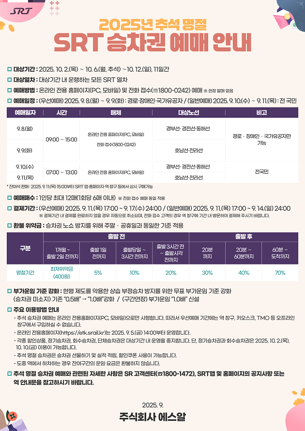 에스알은 추석 명절 기간 전체 공급 좌석 60만9260석의 20%인 12만1852석을 교통약자 대상 우선 예매로 진행했으며 6만7018석이 판매됐다.