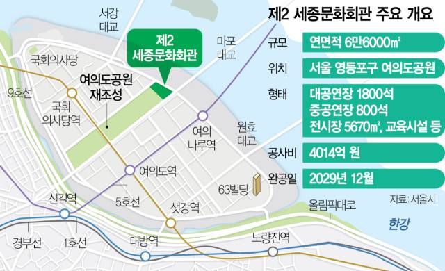 제2세종문화회관은 서울시가 2023년 발표한 ‘그레이트 한강 프로젝트’의 핵심 사업 중 하나로 여의도 공원 재구조화 사업의 일환이다. 서울 영등포구 여의도동에 위치한 여의도 공원 내에 부지 면적 3만 4000㎡, 전체 연면적 6만 6000㎡규모로 조성된다.