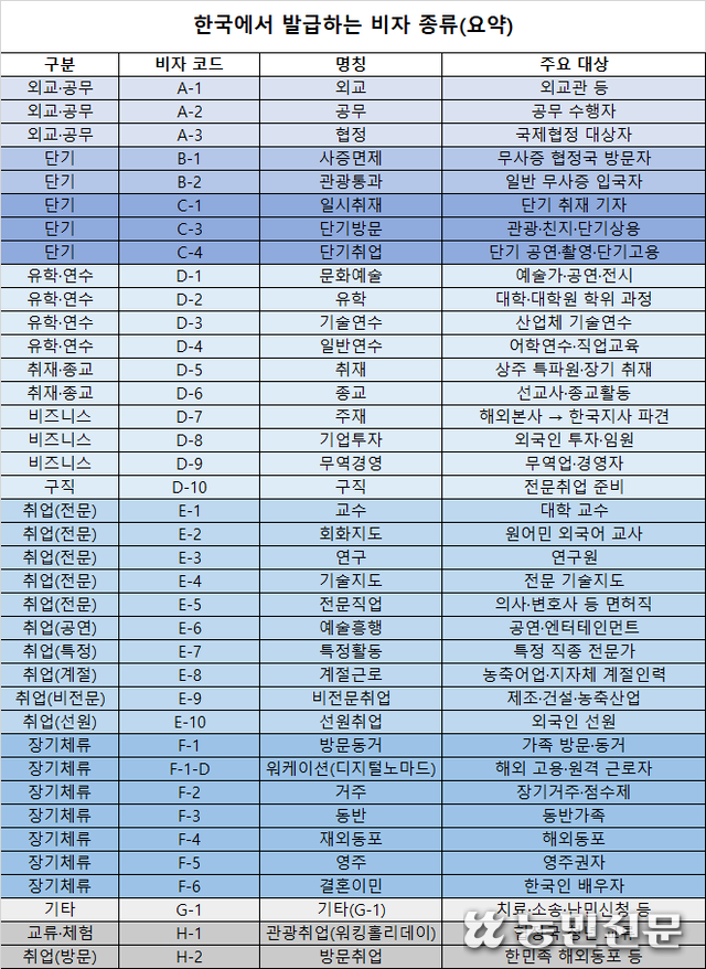 대한민국 비자포털에 따르면, 우리나라 비자는 입국 목적별로 분류돼 있다. 비자 코드는 알파벳과 숫자로 구성돼 있다. 크게 ▲외교·공무(A) ▲사증 면제 및 무비자(B) ▲단기 체류(C) ▲장기 체류(D) ▲전문·취업(E) ▲가족·거주(F) ▲기타(G) ▲관광 취업 및 방문 취업(H)이다.