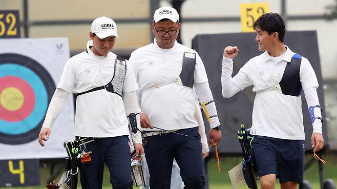 ▲ 2025 세계양궁선수권대회 리커브 남자 단체전 4강에서 승리한 한국 선수들이 서로를 격려하고 있다. 왼쪽부터 이우석, 김우진, 김제덕.