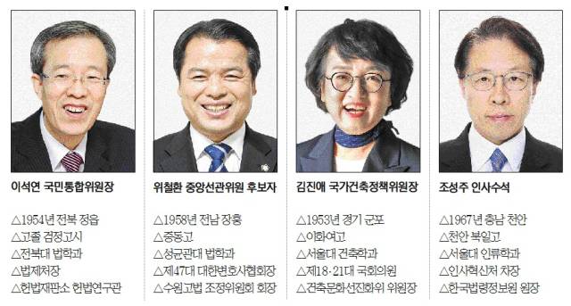 아울러 이 대통령은 이날 중앙선거관리위원회 위원 후보자에 위철환 변호사를 지명했다. 위 변호사는 대한변협 최초의 직선제 회장으로 경기 중앙지방변호사 회장 및 언론중재위원회 감사를 역임한 30여 년 경력의 법조인 이력을 갖췄다. 강 실장은 “선거를 부정하는 무차별적인 음모론으로부터 민주 절차를 보호하고 국민께 신뢰받는 선관위를 만들어 갈 적임자”라고 평가했다. 위 변호사는 이 대통령과 사법시험·사법연수원 동기로 연수원 같은 반이자 '밥 친구’로 자주 어울린 절친이라고 알려졌다. 지난 대선 당시 ‘이재명 지지 선언’에 이름을 올린 법학교수 566명 중 한 명이다.