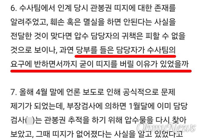 작성자 A는 이 대목에서 큰 의구심을 제기한다. 그는 "수사팀에서 인계 당시 관봉권 띠지 존재를 알려줬고, 훼손 혹은 멸실하면 안 된다는 사실을 전달한 것이 맞다면 압수 담당자의 귀책은 피할 수 없을 것으로 보인다"라면서도 "과연 (원형보존) 당부를 들은 담당자가 수사팀의 요구에 반하면서까지 굳이 띠지를 버릴 이유가 있었을까"라는 의문을 제기했다. 이 질문을 바꿔 말하면 '상부의 지시 없이 막내들이 단독으로 압수물을 훼손할 수 있었겠나'로 해석된다.