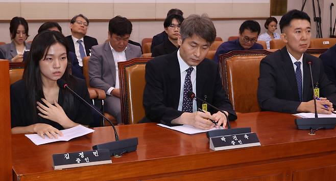 | ▲ 건진법사 전성배씨 자택 압수수색 당시 압수계에 근무했던 김정민 서울남부지검 수사관(왼쪽 첫번째)이 5일 오전 국회 법제사법위원회 법안1심사소위에서 열린 검찰개혁 입법청문회에 증인으로 출석해 관봉권 띠지 훼손·분실된 사안에 대해 의원들의 질의에 답변하고 있다. |