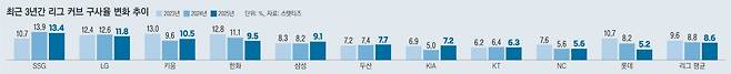 구단별로는 SSG가 돋보인다. 지난해(13.9%)에 이어 올 시즌도 커브 구사율 13.4%로 리그 전체에서 가장 높다. 외국인 원투 펀치 드류 앤더슨과 미치 화이트가 커브 구사율 20.9%, 19.5%를 각각 기록 중이다.