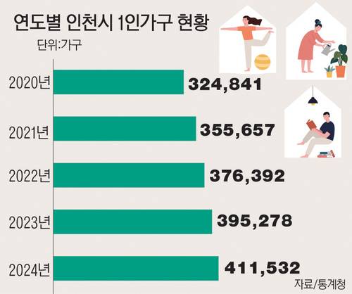 인천에서 최근 5년간 1인 가구 수는 증가하고 있다. 통계청 자료를 보면 인천 내 1인 가구는 2020년 32만4천841가구, 2021년 35만5천657가구, 2022년 37만6천392가구, 2023년 39만5천278가구로 계속 늘었고 지난해 41만1천532가구로 처음 40만 가구를 넘어섰다.