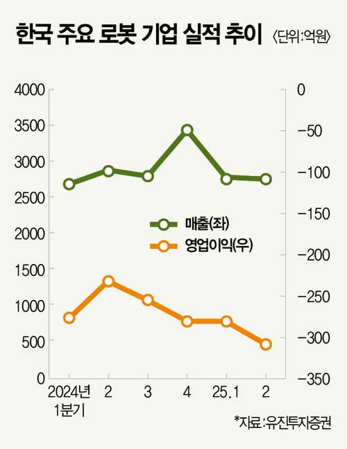 근거 없는 말은 아니다. 일단 실적이 좋지 않다. 유진투자증권은 자체적으로 분류한 주요 로봇 기업(레인보우로보틱스·두산로보틱스·유진로봇·로보스타·뉴로메카 등)의 올해 2분기 합산 매출을 2739억원으로 봤다. 지난해 같은 기간(약 2900억원)과 비교하면 5% 감소했다. 영업이익은 상황이 심각하다. 308억원 영업손실로 지난해 대비 적자폭이 확대됐다. 양승윤 유진투자증권 애널리스트는 “여전히 정체된 실적 성장 흐름에서 벗어나지 못하고 있다‘고 꼬집었다.
