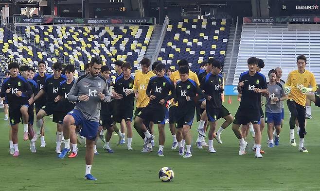 | 가벼운 몸놀림 한국 축구대표팀 선수들이 9일 미국 테네시주 내슈빌의 내슈빌SC 훈련장에서 달리기로 몸을 풀고 있다. 대한축구협회 제공 |